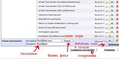 Это поле служит для добавления игры в список, добавлять нужно исполняемый файл. (К сожалению я точно не знаю исполяемого файла в ПБ , но при загрузке игры после проверки в процессах на врея висит pointblank.exe по этому руководствуясь дибильной логикой , я добавил pointblank.exe и на всякий случай остальные exe из папки , но далее мануал будет чисто по pointblank.exe) В pointblank таким файлом является pointblank.exe, находится он в корневой папке , путь к нему выглядит как [ваш диск]\4Game\PointBlank\PointBlank.exe